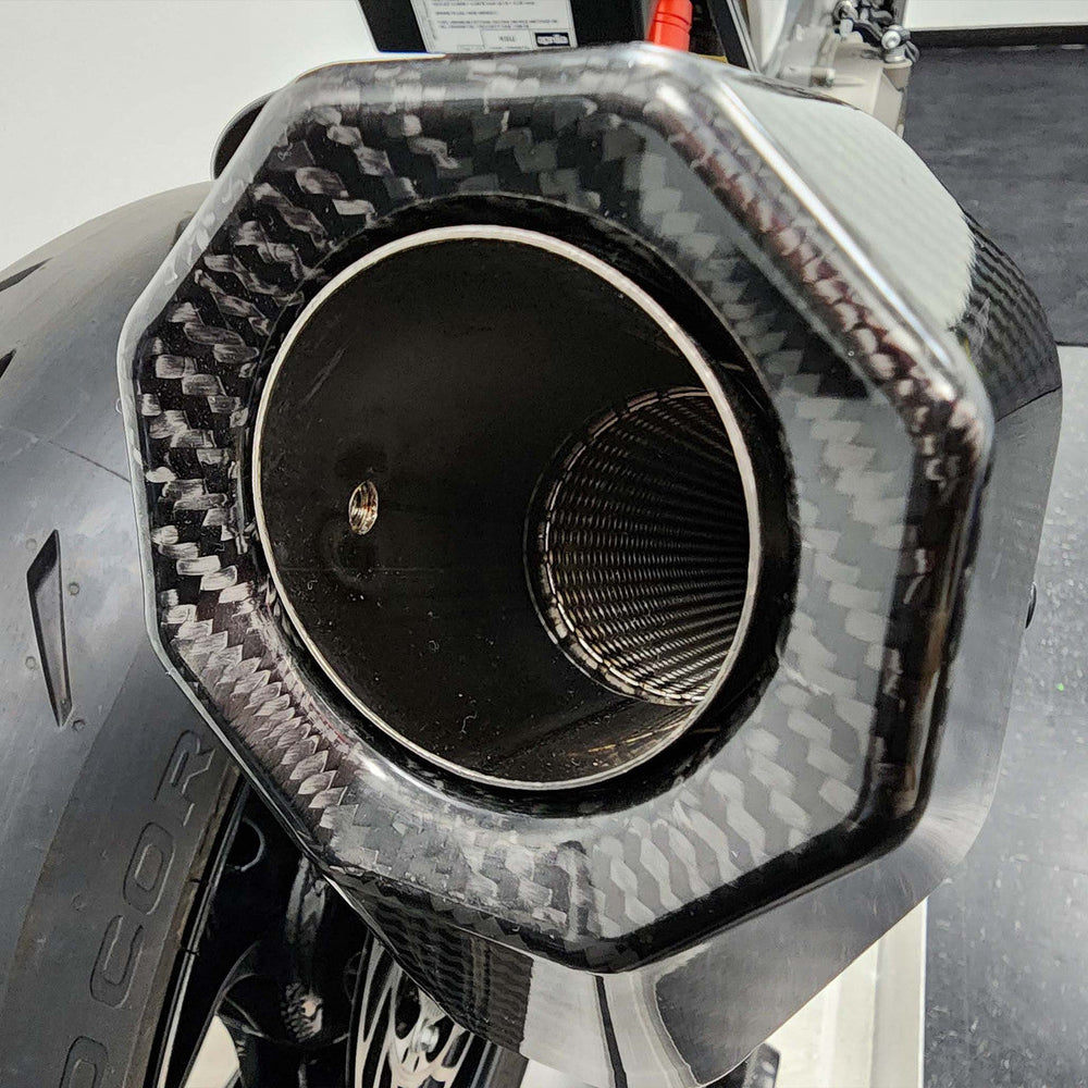 - New Octagon Silencer Design Featuring: Titanium silencer body with Titanium end caps and a Carbon Fiber beauty cover. The new silencer has greater volume for reduced sound, long life and a deep throaty exhaust note