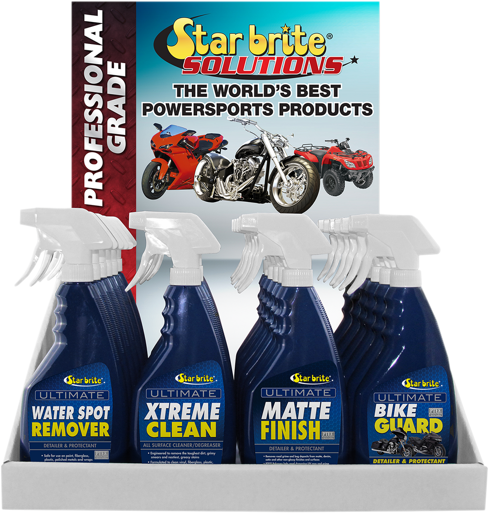 • Each display comes loaded with six 22-ounce spray bottles of Ultimate Xtreme Clean, Ultimate Bike Guard, Ultimate Water Spot Remover, and Ultimate Matte Finish