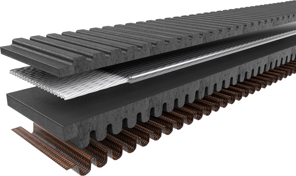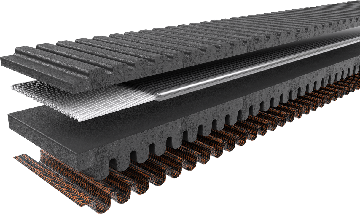 • Carbon tensile cords are bonded to aramid fiber-loaded rubber with specially formulated adhesion gum, resulting in increased side-load resistance, preventing belt distortion and edge cord pullout