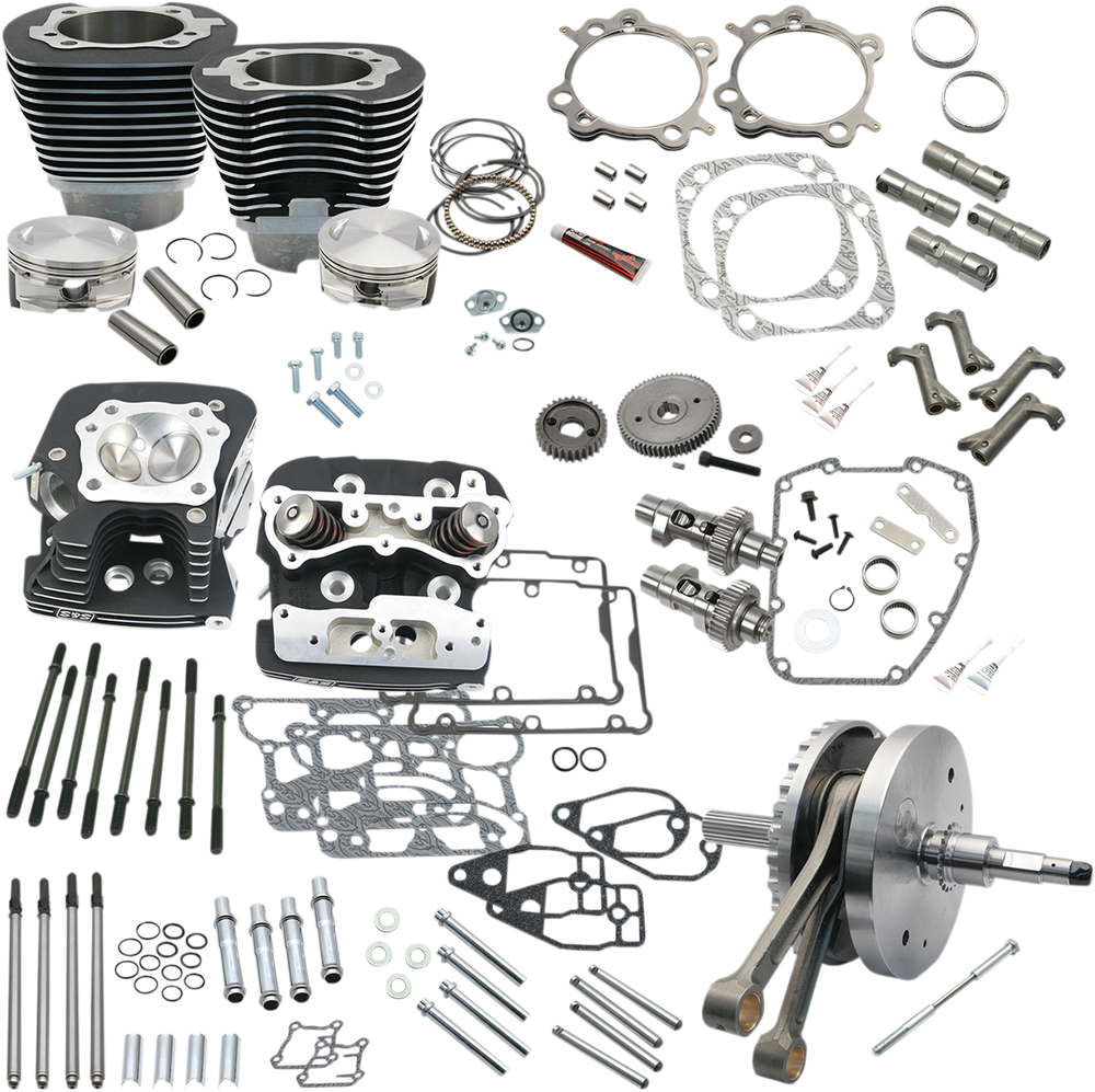 The S&S Hot Setup kit for Twin Cams allows a Twin Cam owner to convert a stock engine to 124" using the stock crankcases Includes S&S 4-1/8" bore pistons, big bore cylinders finished in wrinkle black powder coat, a dynamically balanced 4-5/8" stroke three piece flywheel assembly complete with S&S heavy duty connecting rods and integral mainshafts, S&S 640 gear drive Easy Start camshafts, S&S chromoly steel adjustable pushrods, S&S premium tappets, and S&S Super Stock 91cc cylinder heads When installed the kit yields a 124" engine with a compression ratio of 11:1 Fuel system is not included Available in black powder-coat finish Made in the U.S.A. This project requires crankcase modifications. It is the responsibility of the person assembling the parts to check all clearances and assembly specifications.