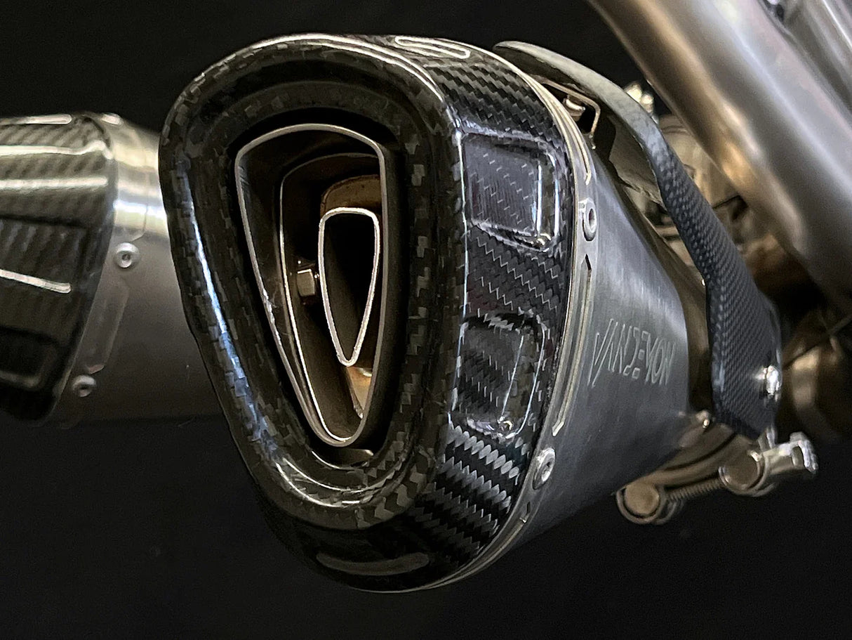 Vandemon gives you the most comprehensive Titanium Sports Exhaust system for the Panigale V4, complete with carbon fibre, stainless steel heat shields, and mounting hardware.