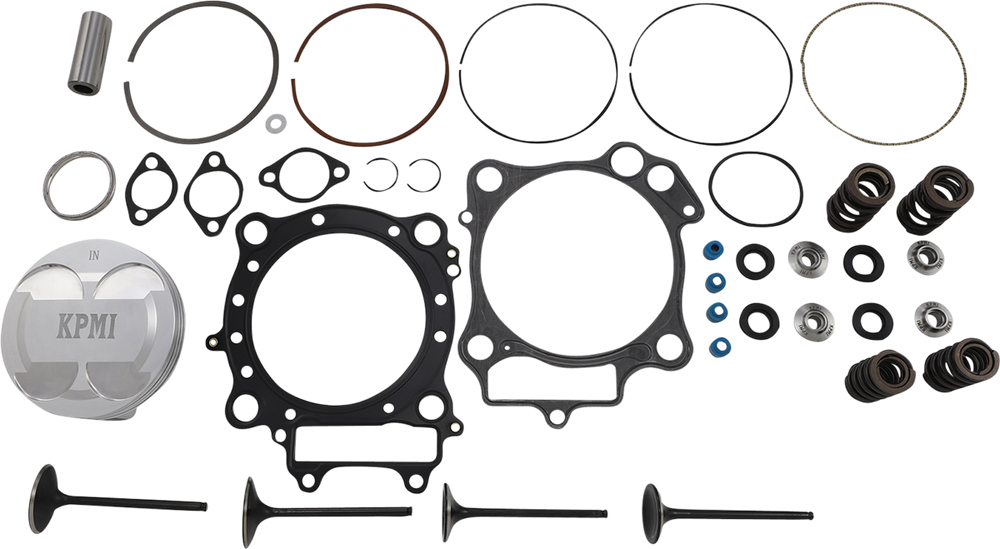 • Kit includes: piston, rings, clip and pin, Cometic top end gasket kit, Black Diamond engine valves (standard size) and dual spring titanium retainer springs (.395" lift intake, .0370" lift exhaust)