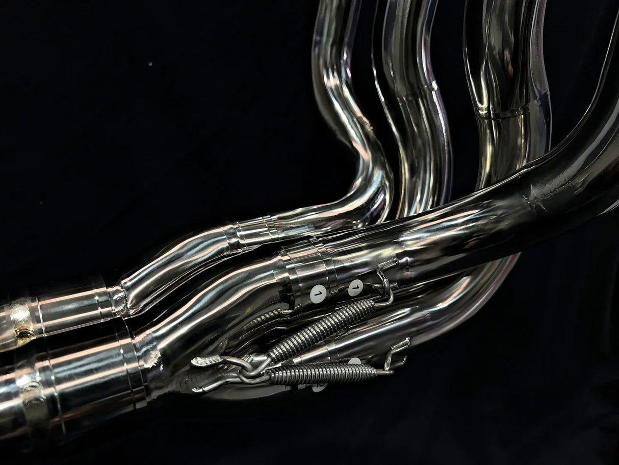 With noise regulations worldwide becoming more strict, Vandemon came up with a unique Bimodal valve muffler that, at the press of a button, you can choose from OEM quiet or straight-through unrestricted power with a standout sound to match. This purpose-made full exhaust system is made from polished Ti1 Titanium with a very bespoke & unique muffler that has two separate chambers which is the same as having two exhaust systems in one. How Does It Work? With a Titanium butterfly valve mounted before the muffler, the exhaust gas is redirected via a more conventionally baffled section of the muffler that reduces noise to OEM DB levels. when the valve is in the open position exhaust gas will then choose the path of least resistance and exit via the straight-through un-baffled section of the muffler.